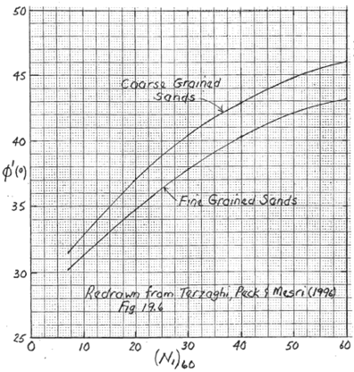 Method 3 : Defines friction angle as per Terzaghi, Peck & Mersi (1996). Three curves are presented for fine, coarse