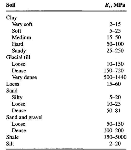 Typical values of young’s modulus of soil are presented as a guideline below.
